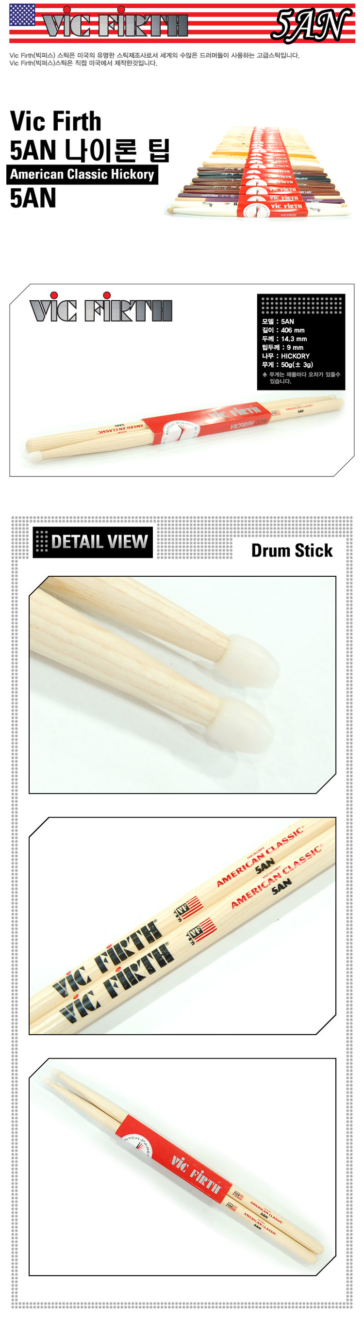 빅퍼스 VicFirth 5AN 나일론팁 American Classic Hickory 5AN